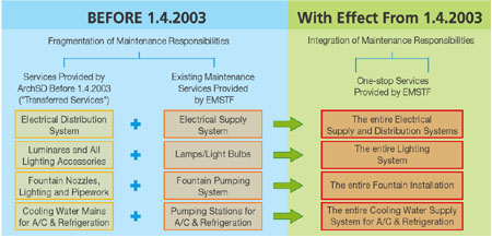 「转移服务」的新工作安排于2003年4月1日生效,其过渡期最迟于2005年4月1日结束。此等安排适用于所有客户,唯医管局除外,因为建筑署会继续为医管局直属医院提供「转移服务」,直至2004年3月31日为止。