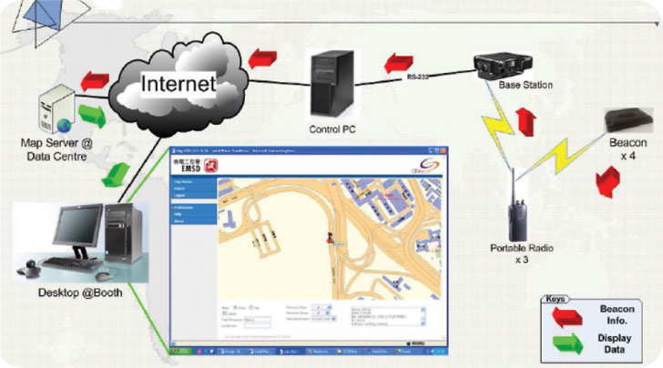 機電工程署最近推介的一項創新定位系統 RadioCom Positioning 便完全解決了以上問題。其系統設計結合了微型發射和接收器,及現成晶片:發射器可放置在任何封閉的地方,如室內和地窖,撇除任何環境障礙;而接收器則是一般常用的無綫對講機,接收器所接收到的訊號會上傳至控制中心,藉以確定攜帶對講機者的位置。而於一般建築物無法接收到 GPS 和手機網絡訊號的地方,利用無綫對講機,便可按用戶需要設定接收訊號範圍。