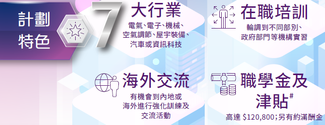计划涵盖 7 个行业范畴,由导师提供专业培训,让学员获得一技之长,为各政府部门及公营机构提供各项机电装置的操作、保养、维修、改装及加装服务。