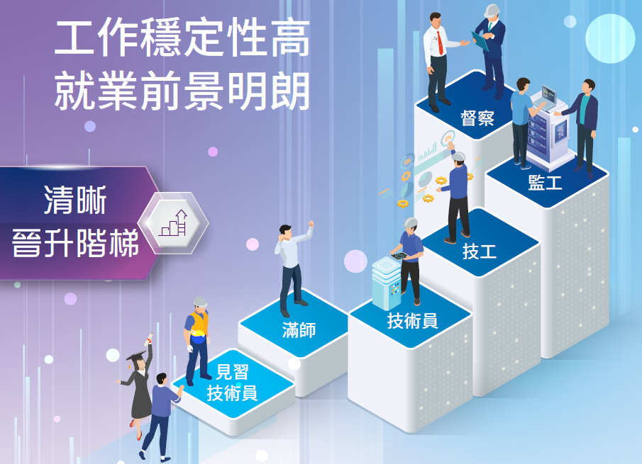 机电行业的前景明朗,且机电署提供明确的晋升制度,见习技术员满师后,可经内部招聘投考一级/二级技术员,其后可以晋升至更高职位,如技工、监工、督察、总技术主任/总电子督察等。