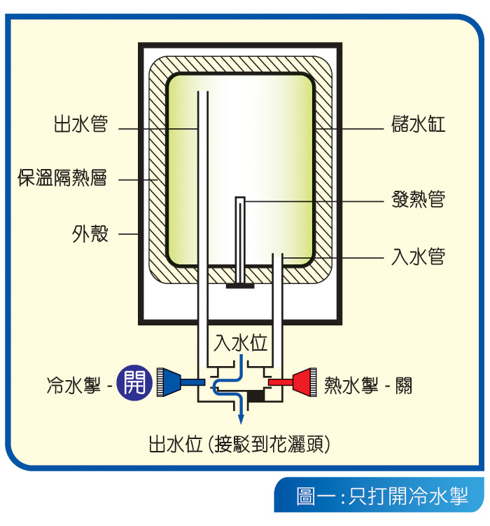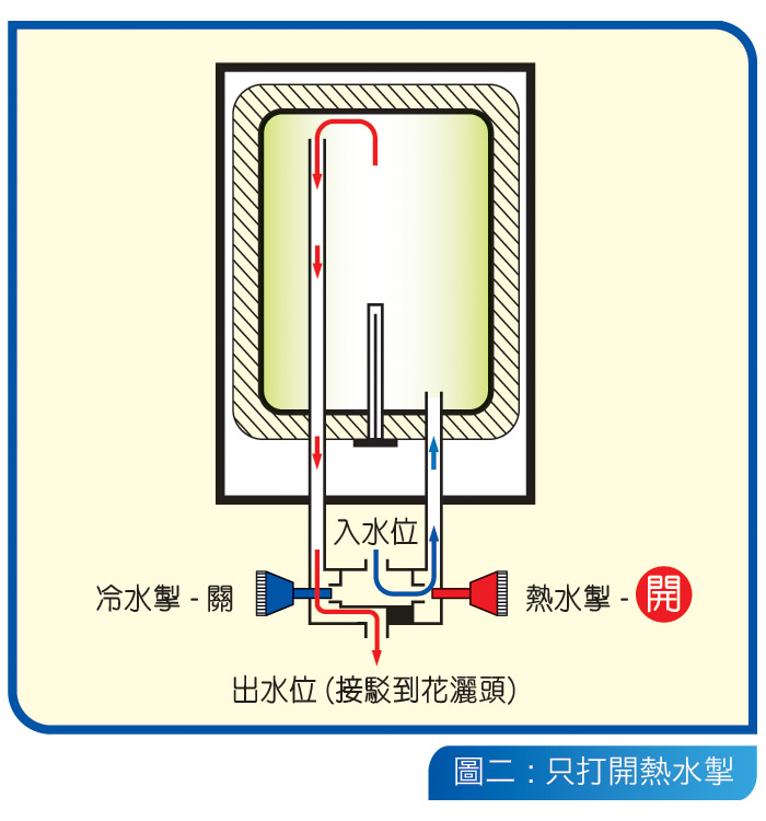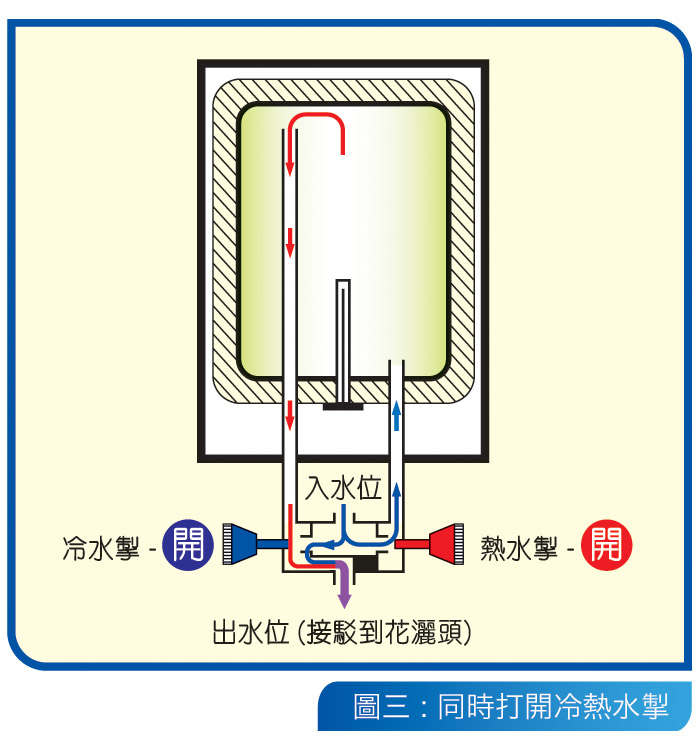 花洒式电热水器的出水混合掣并不是一般的水掣,它的热水掣是安装在冷水进入热水器的途径上,而热水流出热水器的途径上是并没有任何水掣的。若只打开冷水掣,冷水会直接经混合掣流出(图一) 。而当只打开热水掣,冷水会从储水缸的底部进入电热水器,缸内的热水会从顶部的出水管经混合掣和花洒头流出(图二) 。若同时打开冷热水掣,冷水便会进入混合掣内,与从储水缸流出的热水混合,把出水调较至合适的温度(图三) 。