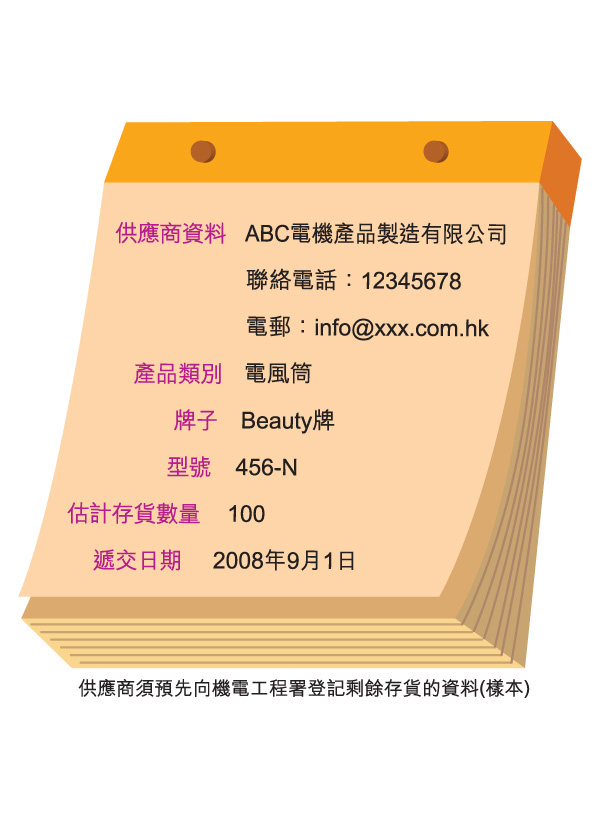 至于已进口而又符合旧版标准电气产品的剩余存货,机电工程署与业界亦已达成共识,供应商仍可于市场供应已登记符合旧版标准的剩余存货;但供应商必须于今年9月1日至11月30日期间,预先向机电工程署登记有关剩余存货,并递交下列表格样本内的资料,才可继续供应。若供应商仍未登记,请紧记于11月30日或之前登记有关资料,否则,由12月1日开始,他们只能在市场上供应符合新版国际电工委员会标准IEC 60335系列标准的电气产品。