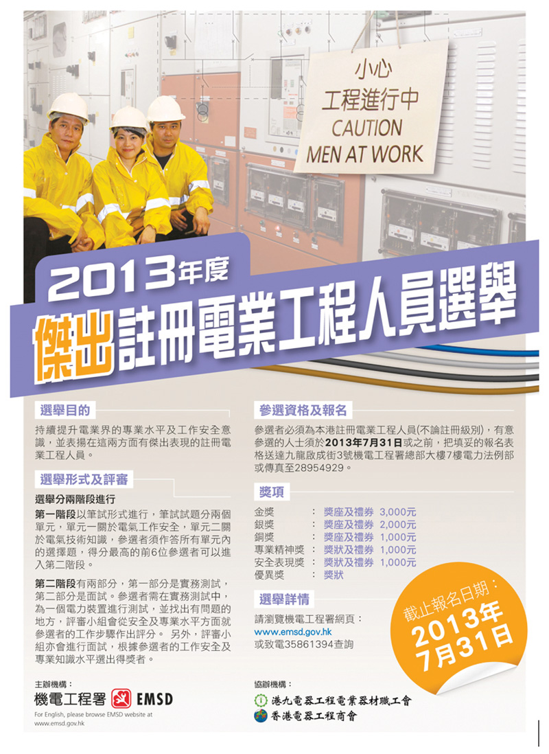为持续提升电业界的专业及安全水准和表扬业界中有杰出表现的电业工程人员,机电工程署再度与业界团体合作举办「杰出注册电业工程人员选举」 ,藉以表扬优秀的业界工作者,而得奖者也可趁此机会与同业分享日常的工作经验和心得,以供同业借镜。