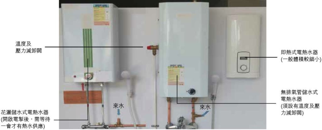市面上供家庭使用的电热水器主要有即热式、花洒储水式和无排气管储水式(又称高压型)电热水器(图五)。这些电热水器虽然已有适当的保护装置,但过往亦偶然发生涉及电热水器的事故。调查结果显示,有关事故的肇因主要是安装不当及缺乏维修。