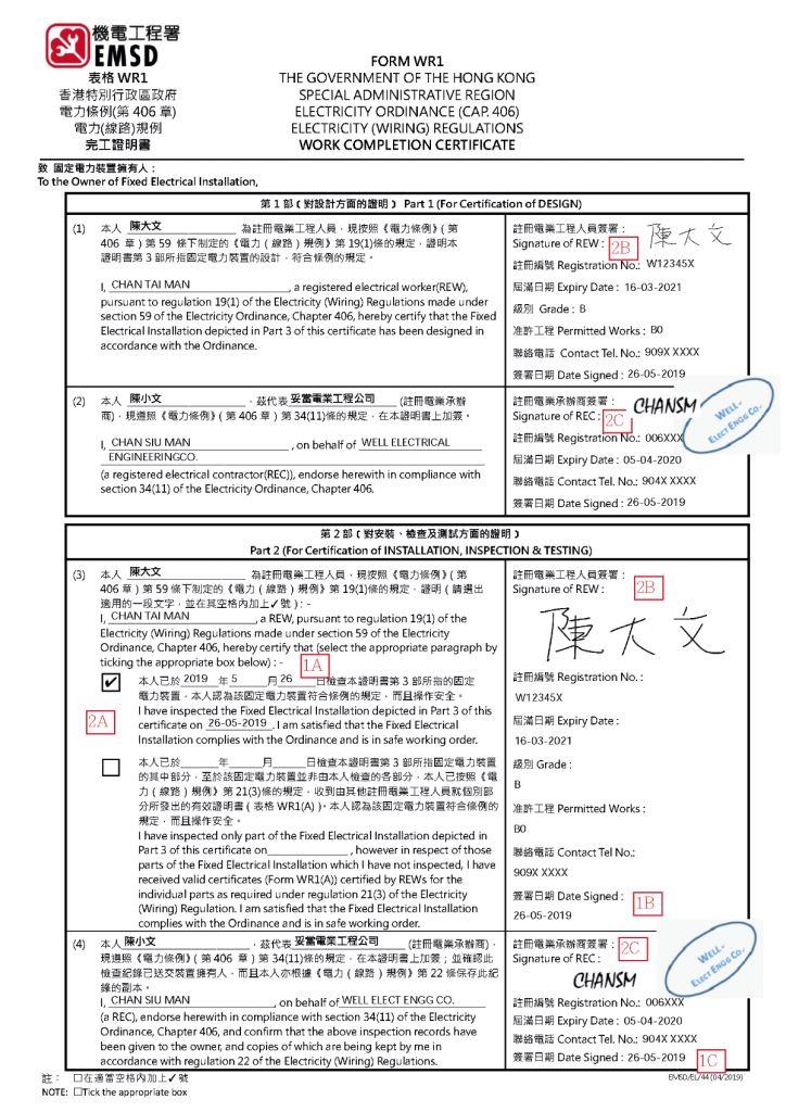 根据《电力(线路)规例》,负责固定电力装置的修理、改装或增设工作的注册电业工程人员须于完成有关工作后,在通电以供使用前,检查、测试及发出完工证明书(表格 WR1 ),以确认该装置符合有关规例的技术及安全规定。该注册电业工程人员亦应把已签妥的完工证明书交予雇用他的注册电业承办商加签,同时,有关注册电业承办商须妥善保存该完工证明书最少五年。