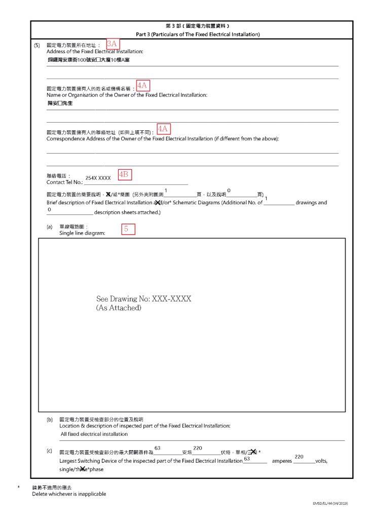 再者,机电署人员在审核发电设施注册申请的过程中检视完工证明书时,不时发现完工证明书内所填写的资料出现遗漏或错误,因而须要求有关注册电业工程人员/注册电业承办商澄清或更正。以下列出一些常见问题,以及正确填写方法和提示,以供参考(请参阅以下附图附上的填写完工证明书范例)。