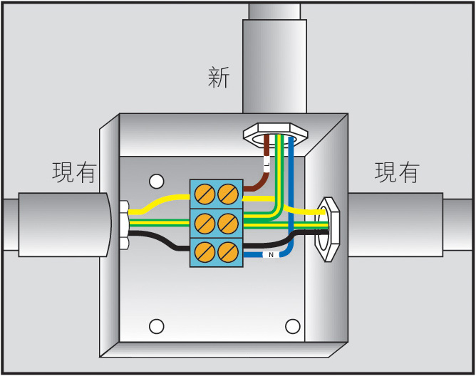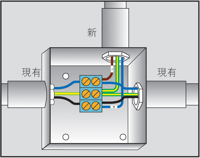 须在新电线近接驳处附近(见图5 ( a )至5 ( d ) )加装适当、耐用及清晰的标籤或代号例如电线拉条、套管、套圈等) 。这项规定旨在划一在被视为不可正确识别电路上的安装方法,以避免把旧「蓝色」电线(相线)误认作新「蓝色」电线(中性线) 。