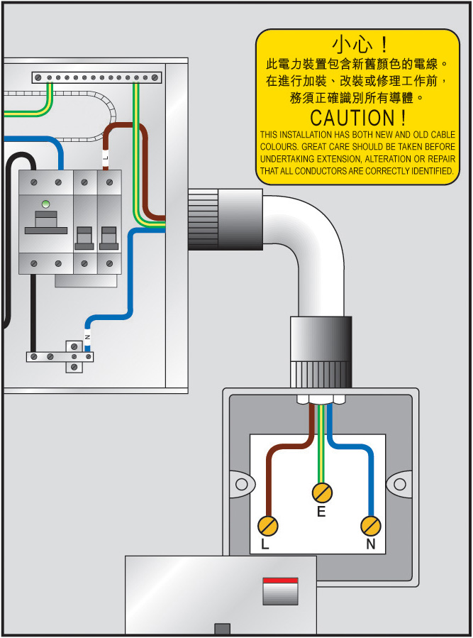 若要在采用旧颜色代码电线的现有装置安装新颜色电线,则须在最接近受影响装置的上游配电箱(例如主配电板、次配电箱或用户总配电箱)上或旁边展示黄色的中英文警告性告示(见图3 ) 。警告性告示必须耐用,并能牢固地固定于配电箱的表面或旁边。中英文字应能清楚看到。 「小心」及「 Caution 」字样的高度不得少于1 0毫米,其他字的高度则不得少于5毫米。警告性告示的最小面积则为100毫米(阔) × 75毫米(高) 。