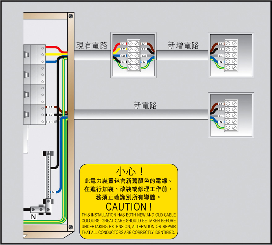 上述更改适用于所有新电力装置以及对现有电力装置进行的加装及改装工程,采用旧颜色代码电线的现有装置则不受影响。