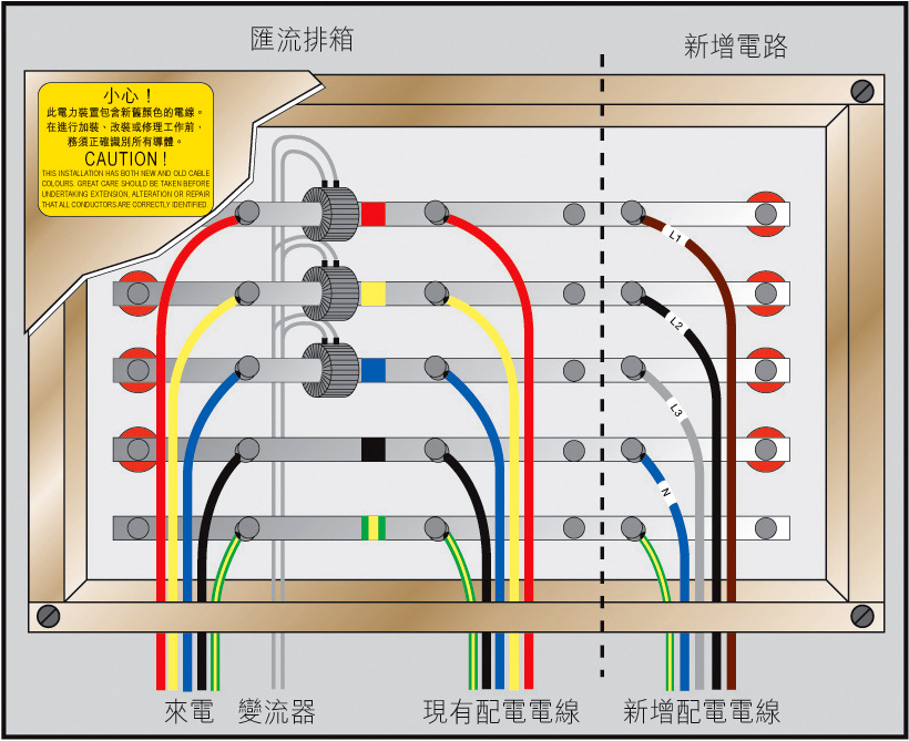 在电线接驳处,须在新旧相线及中性线加上适当、耐用及清晰的L1 、 L2 、 L3及N等标记(见图6 ) 。图7所示为在现有三相汇流排箱加装新颜色电线时可接受的标记方法。