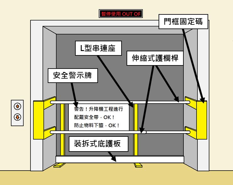 针对以上情况,可固定在外门门框的便携式防堕护栏组合(下称护栏组),可在外门开启时为工程人员提供防堕保护。 护栏组由一对伸缩式护栏杆、一对 L 型串连座、一对门框固定码、一块装拆式底护板以及一块安全警示牌组装而成。伸缩式护栏杆可调校长度,令护栏组可为不同阔度的升降机外门提供保护,配合不同尺码的装拆式底护板,更能防止物料及工具由外厅跌进升降机井道。一对门框固定码使护栏组可稳当地固定在外门门框,而醒目的安全警示牌则可提醒工程人员须注意的安全要项。 优点