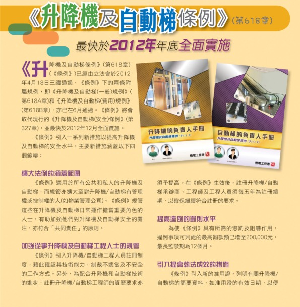 更详细关于 《升降机及自动梯条例》(第618章)最快于2012年年底全面实施