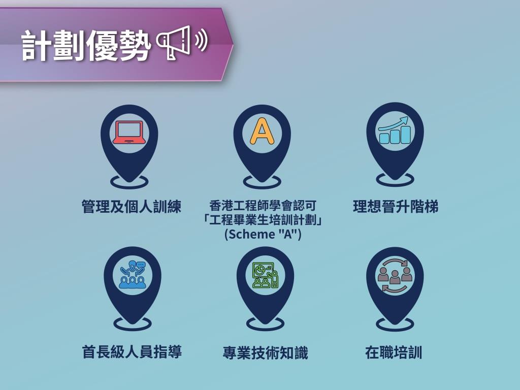 機電工程署的「見習工程師訓練計劃」是獲香港工程師學會認可的「工程畢業生培訓計劃」( Scheme "A" ),並提供以下 6 大行業的專業培訓。機電工程署的首長級人員會為見習工程師提供指導,以支援見習工程師的專業及職涯發展。