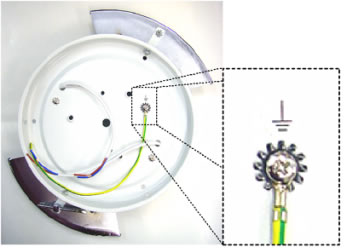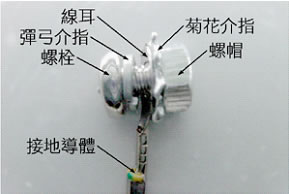應確保接地終端接駁妥當及鎖定在適當位置。應使用「菊花介指」及「彈弓介指」確保燈飾有效接地。「彈弓介指」乃用以鎖緊接地終端,防止鬆脫,而「菊花介指」則用以去除金屬表面的顏料塗層,以確保接地電路無阻。