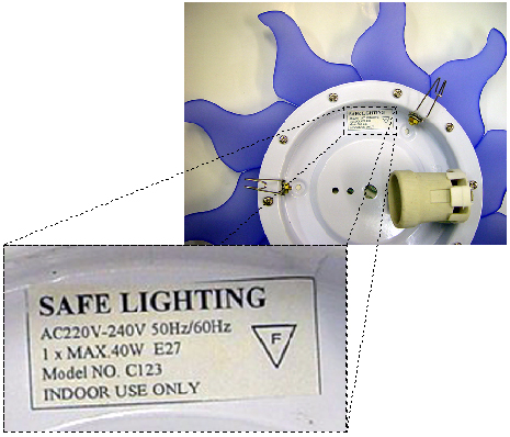 符合安全標準的燈飾會有適當的標記,包括額定電壓、額定頻率、額定功率、燈泡的數目和類別、型號、原產地標誌(製造商名稱或商標)、是否適宜直接安裝在可燃物質表面的標誌、與被照物的最短距離的標誌,以及是否屬於第II類燈飾的標誌。