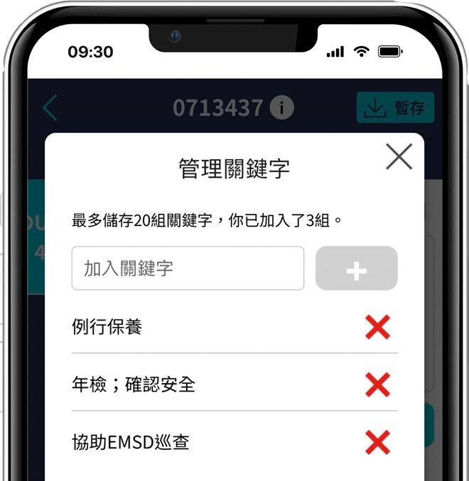 數碼工作日誌的流動應用程式加入了「自訂關鍵字」功能,讓工程人員填寫備註時,能自訂常用的關鍵字,以方便快捷地描述工作內容。